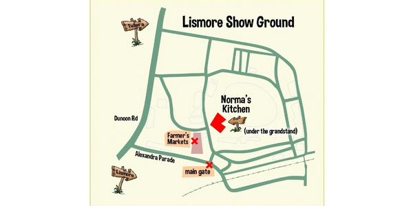 Via the lower entry to Show Grounds (market will be on the left), straight ahead, the Elders sign is on the Norma's Kitchen building. Entry is to the right hand side, unload and then find a park.